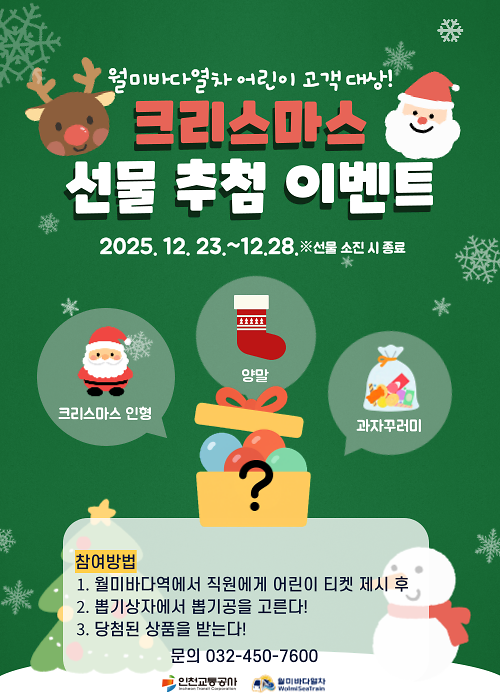 이번 이벤트는 어린이들이 가족과 함께 월미바다열차를 이용하며 연말의 추억을 남길 수 있도록 마련됐다. 13세 이하 어린이를 동반한 월미바다열차 이용객을 대상으로 오는 12월 23일부터 28일까지 월미바다역에서 진행된다.