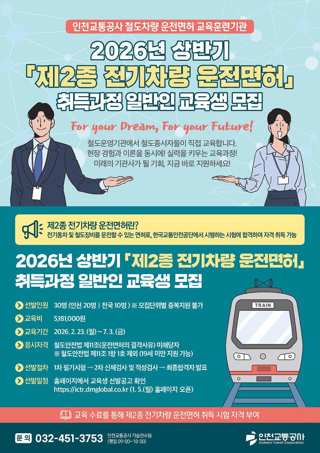 인천교통공사(사장 최정규)는 2026년 상반기 ‘제2종 전기차량 운전면허’ 취득과정 일반인 교육생을 모집한다고 5일 밝혔다.