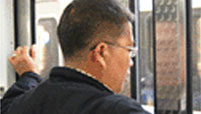 출입문을 양손으로 열고 좌우를 살핀 후 열차에서 내린다